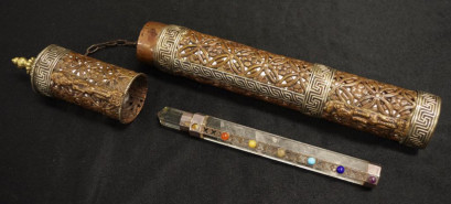 pierced decoration copper cover, containing stone inset, copper decorated prism, (height 35cm approx, copper cover). -