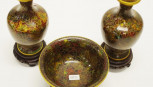 each with carved wood stand, (height 16cm approx, each vase); together with a matching cloisonne bowl, on carved wood stand, (diameter 13cm approx). -