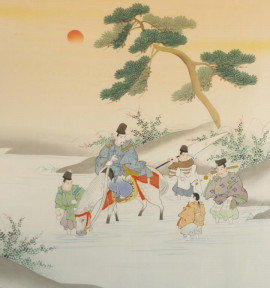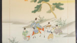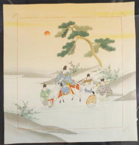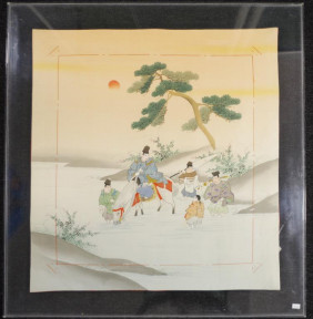 depicting Figures on Horseback crossing a River, mixed media, gouache and embroidery on fabric, attribution on label verso, with reference to exhibition at Royal Hong Kong Jockey Club, 1988, framed in perspex, (68cm X 64cm approx, image).