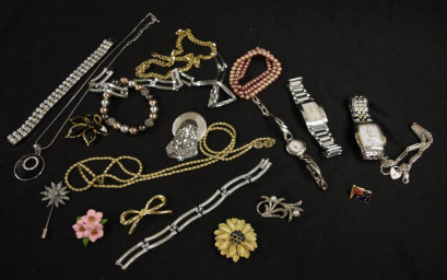 including: necklaces, bracelets, and brooches, and 3 various wrist watches. -