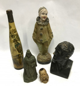 Lot Description:A Queen Victoria Statue, Clown Figure, Kaiser Wilhelm Clay pipe, bust of Demosthenes & decorated wine bottle