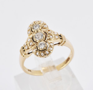 featuring three round cut diamonds of 0.31ct in total, set in 9ct gold. Size O-P. Weight 3.65g. -