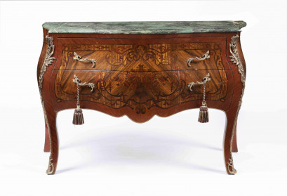 Lot Description:A Louis V style gilt bronze mounted marquetry inlaid marble top commode