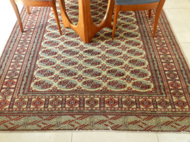 Lot Description:A Persian Rug in Red Navy & Cream with Repeated Gul Pattern & Rosettes