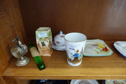 height 12 cm, Grimwade's bubbles tankard, height 11 cm, Shelly rose pansy forget me not dish and lidded sugar bowl, antique plated cherub serviette ring and stand, height 13 cm, lavender water and musk antique green glass bottle with label, height 20 cm, plus Shelley Deco square plate, 16 x 16 cm and hand painted Royal Doulton tulips square plate 15 x 15 cm -