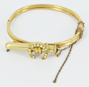 shaped as a horse shoe, enhanced with split pearls, the 'bar' below the horse shoe enclosing a retractable pencil by S. Mordans & Co, with broken safety chain. Tested as 14ct gold. Not marked. Weight all in 18.3g -