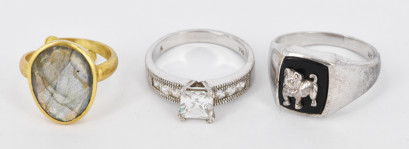 a brass and labradorite one, a silver and paste one and a 'Dog' silver one. Weight silver ones 11.5g -