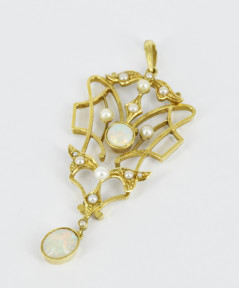 14ct yellow gold, with seed pearls and opals. Weight 4.1g. -