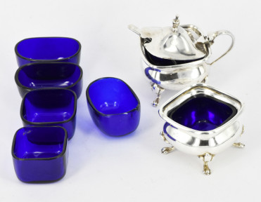 with blue glass liners. Together with FIVE BLUE GLASS LINERS. Hardy Brothers Birmingham 1918. Weight 76.9 grams. -
