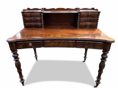 of slender form, set with a gallery back, flanked by three shaped drawers to each side alternating with barley twist supports, above a curved top set with three frieze drawers, on four carved slender legs, 104cm x 119cm x 72cm -