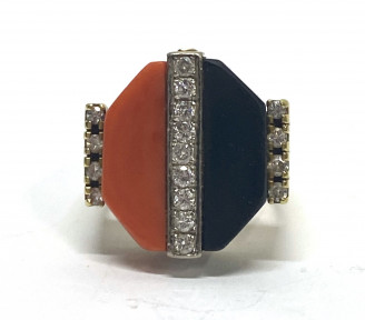 Lot Description:A 14ct Yellow Gold Coral, Onyx & Diamond Ring