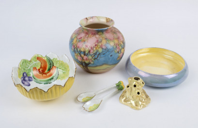 Lot Description:Falcon Ware porcelain vase, English float bowl with flower aid and a Noritake salad bowl with servers, 20th century