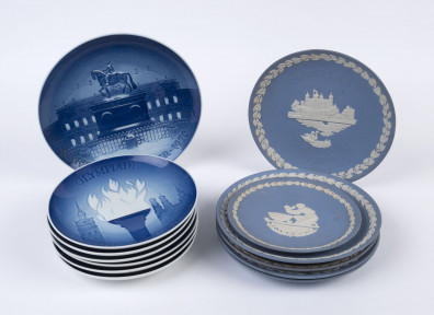 Lot Description:Six assorted WEDGWOOD jasper ware porcelain plates together with seven Danish porcelain plates, 20th century