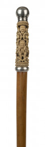 Lot Description:A walking stick with an eastern carved marine ivory handle, English sterling silver top, cane shaft and brass ferrule, 19th century