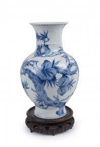 Lot Description:A Chinese baluster shaped blue and white porcelain vase with wooden stand, Republic period