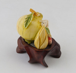 Lot Description:A Chinese carved ivory pomegranate and mouse ornament on wooden stand, early to mid 20th century