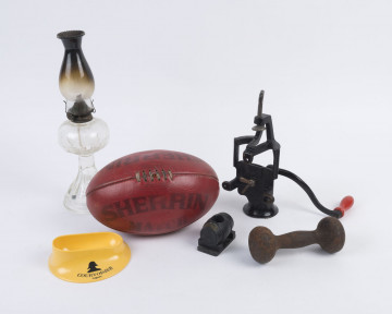 Lot Description:Vintage Sherrin football, Beatrice coffee grinder, vintage oil lamp, old dumbbell weight