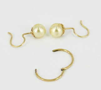 set with imitation pearls, 9ct gold hooks. Together with a single hoop earring. Weight all in 1.9grams -