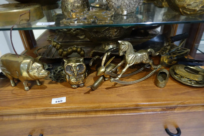 Lot #169 - Shelf of assorted brass wares