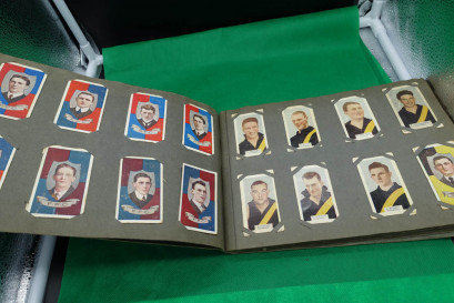 includes 1930's football Carlton, Footscray, Richmond, Geelong, South Melbourne, St. Kilda, Collingwood cards by Standard Cigarettes, B. D. Cigarettes, Kornies, Allen's Irish Moss gum jubes, Magpies Cigarettes, total 109 cards approximately, plus cricket and Olympic games and movies star cards -