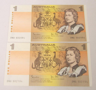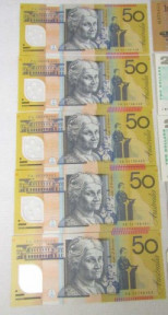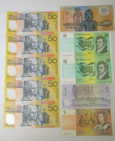 the five polymer uncirculated banknotes depicting Edith Cowan and David Unaipon with serial numbers FA13799458 -62 (5) with 1 x $10 note serial no AB 21602219, 1 x $5 AA 00761112, 2 x $2 notes LNS879765 and LNQ840799, 2 x $1 mint notes serial DNU 502094 & DNU 502104,1 x $1 note used seroal no DOU957713 (12) -