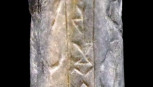 with carved "hero bull man wrestling water buffalo" with vertical cuneiform inscription likely Akkadian. Approx size 32mm x 15mm -