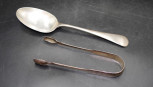 Lot Description:Sterling silver sugar tongs and a soup spoon