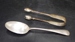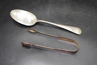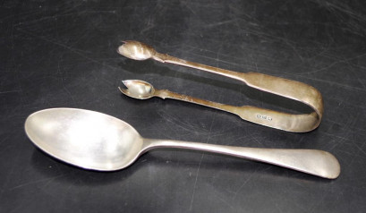 the tongs hallmarked London 1818 maker: HI, and the spoon hallmarked Sheffield 1926, maker: M&W, 115 grams approx -