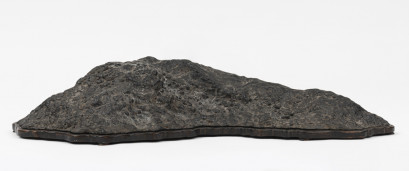 the horizontal stone with ridges resembling a craggy mountain, the surface with natural pale inclusions, on a conforming stand