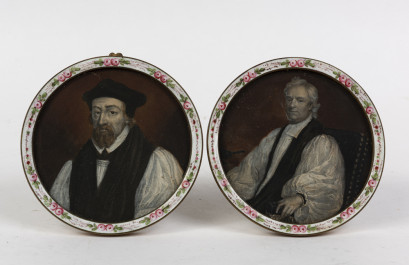 Lot Description:A pair of circular enamel framed portrait miniatures