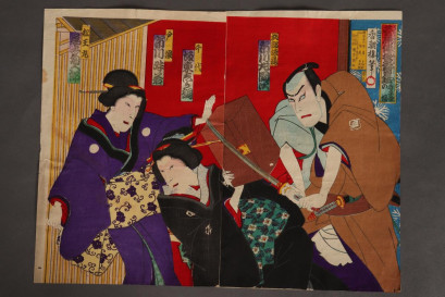 depicting three Kabuki theatre actors with one brandishing a sword, in tones of purple, red and yellow, signed, 36.5cm x 23.5cm (2) -