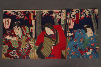 (1835-1900), depicting three Kabuki theatre actors in elaborate robes with swords, in an outdoor setting with blossoming trees and lamps, in bright tones of purple, red, green and blue, signed, 34.5cm x 22cm (3) -