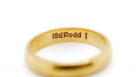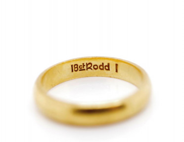marked 18ct Rodd. Approx d end band size 3.4mm, ring size K, weight 3.2 grams -