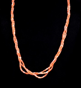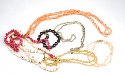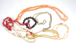 includes two coral (40& 58cm), faux pearl, carved shell necklaces, black pearl bracelet 19cm. The rope twist silver chain is marked sterling length 56cm, weight 26 grams -