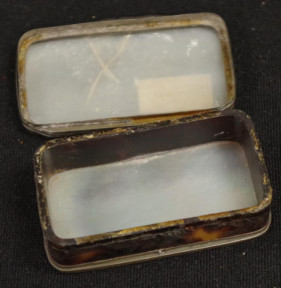 Mother of Pearl inset decoration to lid and base, opening to box of tortoiseshell sides, (hinge requires repair), (length 6cm approx). -