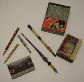 including: 3 various 'dip-in,'pens; and 2 various mechanical pencils, (including 1 gold plated, and 1 with quartz body); and 2 boxed packets of vintage playing cards. -