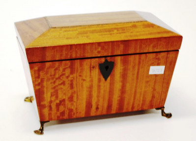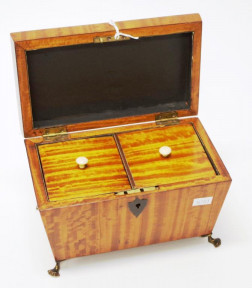from West Indian satinwood, twin lidded interior, ivory knobs, brass paw feet, c1825. (Length 20cm; height 12cm approx). -