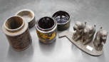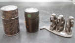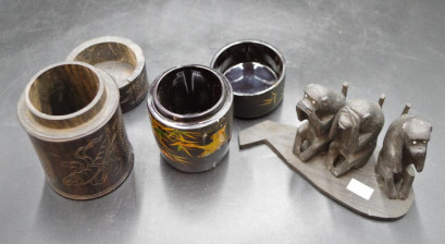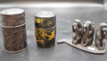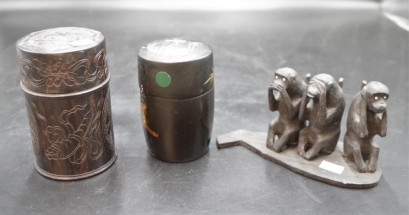 including: Chinese carved wood tea container, (height 12cm approx); a Japanese lacquer tea container; and carved wood figure of Three Wise Monkeys. -