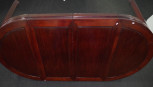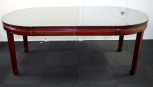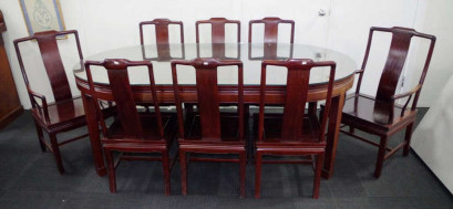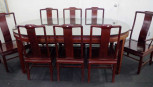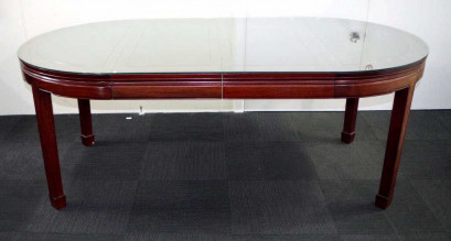 comprising of an extension table with glass cover and 8 chairs, including 2 carver armchairs, 203cm long (including 2 extension leaves 92cm), 112cm wide, 77cm high approx -