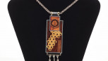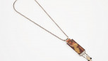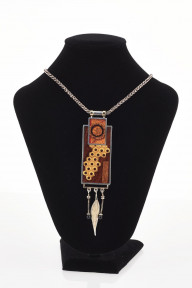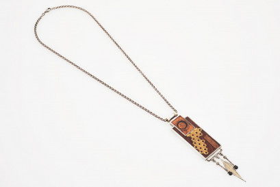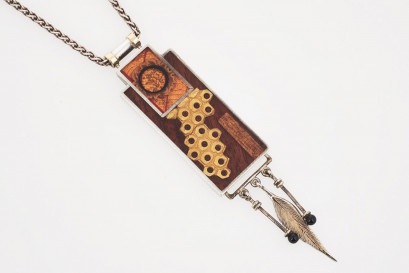 featuring an 18ct white gold pendant with wood and resin inlay, with sterling silver leaf and bar hanging elements stamped 'STL.SIL', '750' with Australian hallmark and Merridee Cram makers mark, upon a sterling silver wheat chain stamped '925'