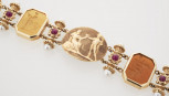 featuring glass intaglios bezel set in 14ct yellow gold, with figurative plaques and fancy links with ruby cabochon and pearl detailing, stamped '14K', 'ITALY' with makers mark