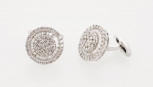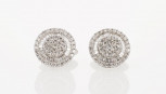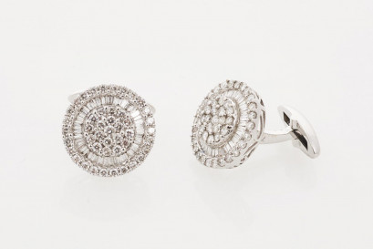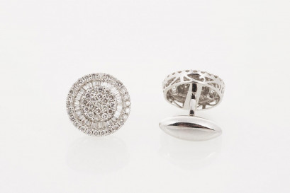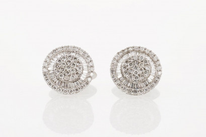 featuring round brilliant cut and tapered baguette diamonds claw set in 18ct white gold in a circular design, stamped '750'