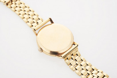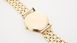 18k gold case with original gold crown, custom made gold bracelet with gold buckle, gold case back serial number 121 014, seventeen jewels manual winding movement, calibre ETA 269