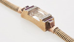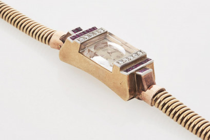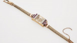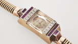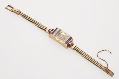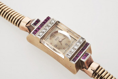 solid case and back, diamonds and red stones set on the case top and bottom, bracelet not signed, swiss manual winding movement, 15 jewels, no calibre or serial number, square dial signed