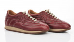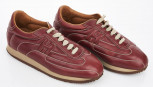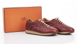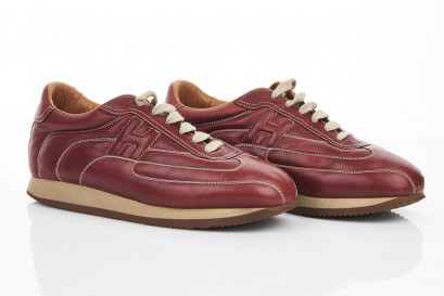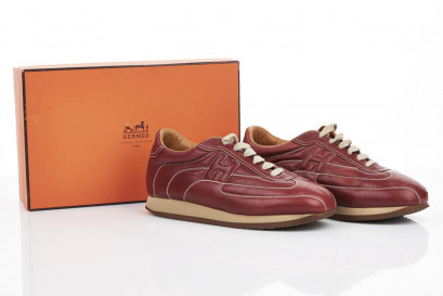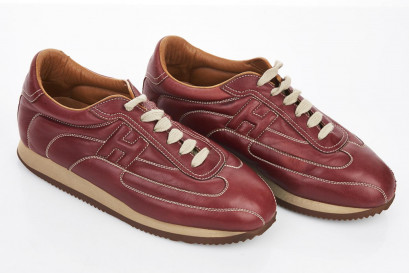 burgundy red with contrast stitching, rubber soles, leather lining, stamped 'Hermes, made in Italy', with dust bags and box