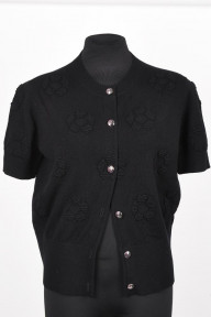 black with embroidered floral detail, ribbing to short sleeves and banded hem, custom logo buttons to front, labelled 'Chanel, made in United Kingdom'