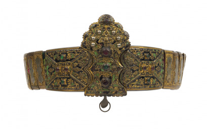Lot Description:An antique Turkic belt, gilt metal and enamel studded with green and red stones, Central Asian origin 18th/19th century
