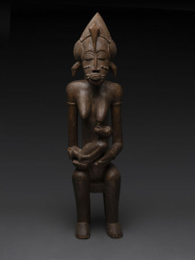 Lot Description:A seated female figure with pelican head dress and suckling baby, carved wood, Senufo tribe, Ivory Coast