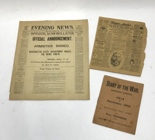 Includes 'Evening News' Sydney Monday November 11, 1918 + 'The Farmer and Settler and Livestock Breeder's Journal' Tuesday November 12th 1918 + Daily News 'Diary of the War' Principal Events 1914 to November 1918, 8pp booklet [3] -