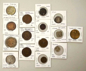comprising of China: 10 cash 1920, 20 cash 1919, Kwangtung 1c, Kinag Nan 10 cash 1902-05, East India Company Malaysia Straits Settlement: 3x1c 1845, US 1c holed 1857, 1c 1874, 1899, 1/2c 1835, Ceylon 5c 1920, Fiji 1/- 1942S, Pannama 50c 1907 and a 1930 Sunnynim USA token -